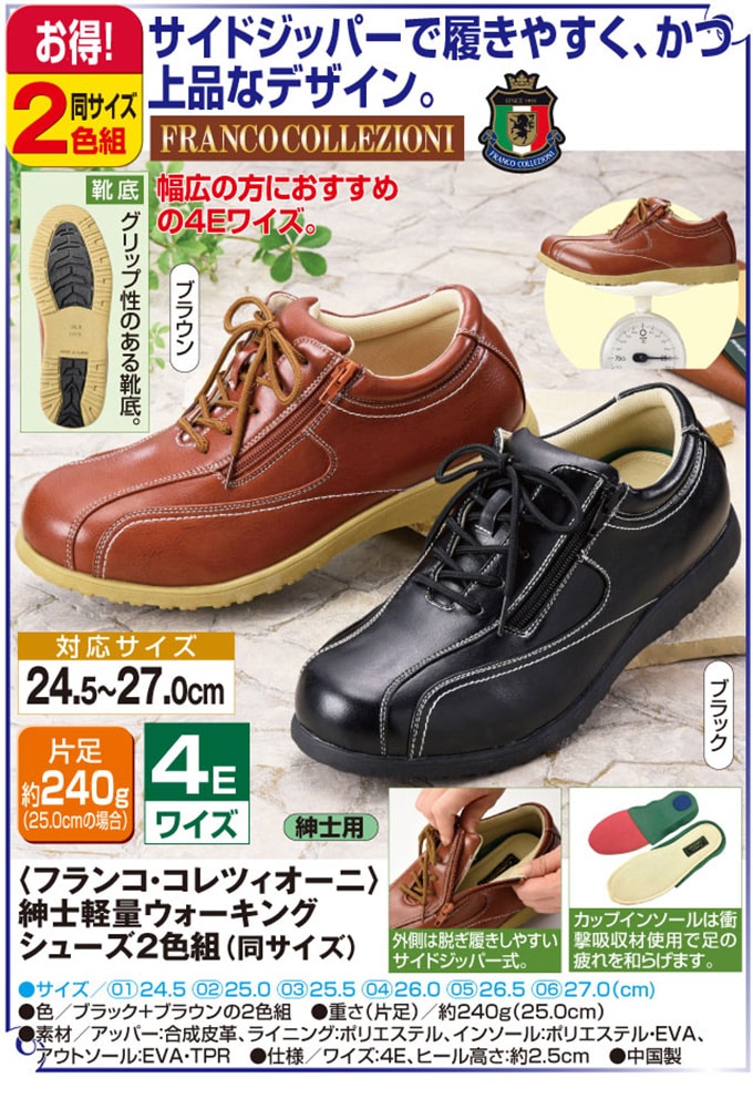 [24.5cm]<フランコ・コレツィオーニ>紳士軽量ウォーキングシューズ2色組 | サイドジッパーで履きやすく、かつ上品なデザイン。幅広の方にオススメの4Eワイズ。