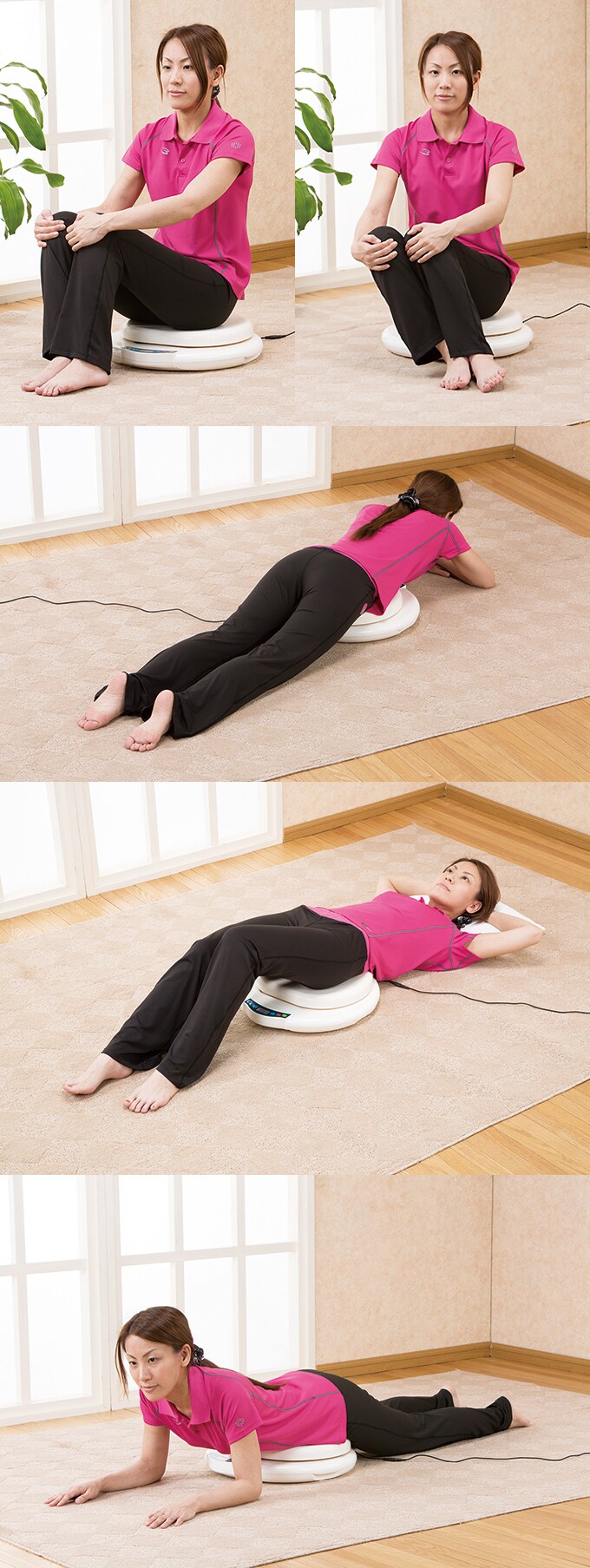 取扱説明書には5つの運動の手引きを用意。座りながら、寝転びながらとリラックスした状態でも楽々回転運動ができます。