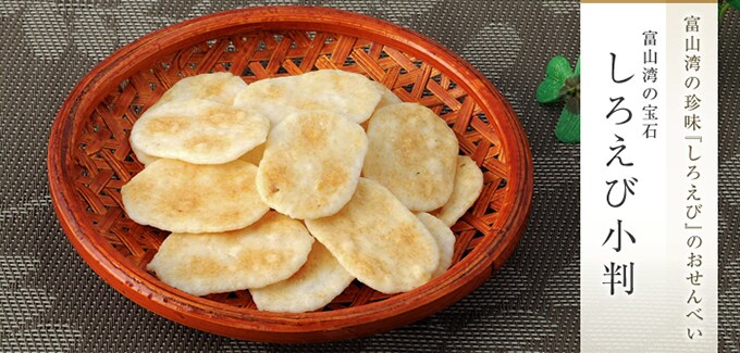富山湾の珍味しろえびを使った、さっぱり塩味のおせんべいです。