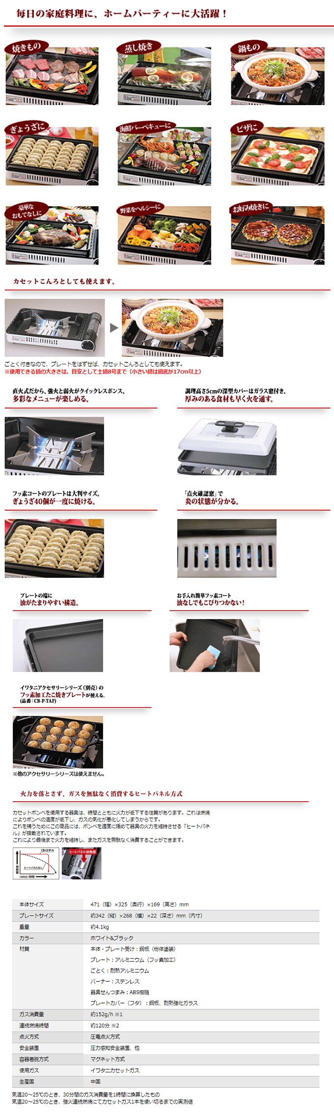 ◆イワタニアクセサリーシリーズ(別売)のフッ素加工たこ焼きプレートが使える。※他のアクセサリーシリーズは使えません。