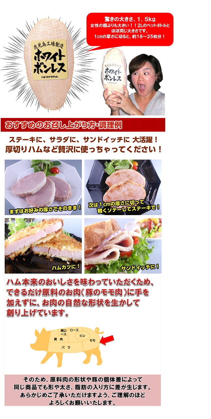 プリマハム ホワイトボンレスハム 1.5kg | 家族を笑顔にする噂の巨大ハム!!