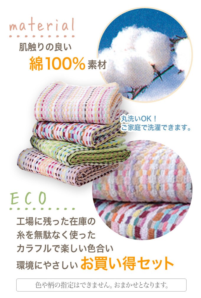 お買得残糸使用エコタオル14枚セット | カラフルで肌触りの良いタオルのセット ※色柄ランダム