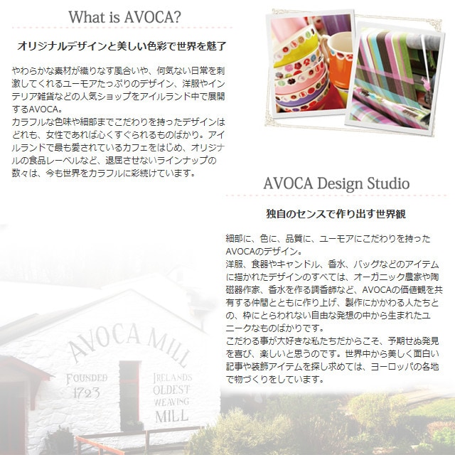 やわらかな素材が織りなす風合いや、何気ない日常を刺激してくれるユーモアたっぷりのデザイン、洋服やインテリア雑貨などの人気ショップをアイルランド中で展開するAVOCA。カラフルな色味や細部までこだわりを持ったデザインはどれも、女性であれば心くすぐられるものばかり。アイルランドで最も愛されているカフェをはじめ、オリジナルの食品レーベルなど、退屈させないラインナップの数々は、今も世界をカラフルに彩続けています。