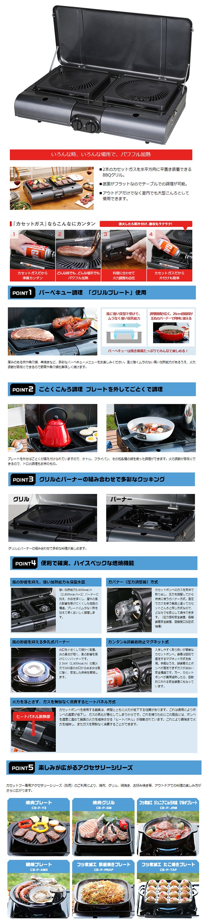 カセットフー専用アクセサリーシリーズ(別売)のご利用により、焼肉、グリル、網焼き、お好み焼き等、アウトドアでの料理の楽しみ方がさらに広がります。