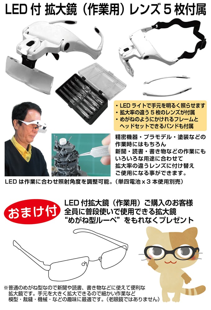 - ハンズフリー作業用ルーペ(LEDライト・倍率変更レンズ5枚付)