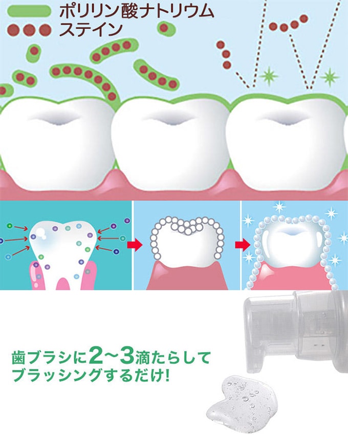 使い方もとっても簡単です。いつもの歯ブラシに2~3滴たらしてブラッシングするだけ!