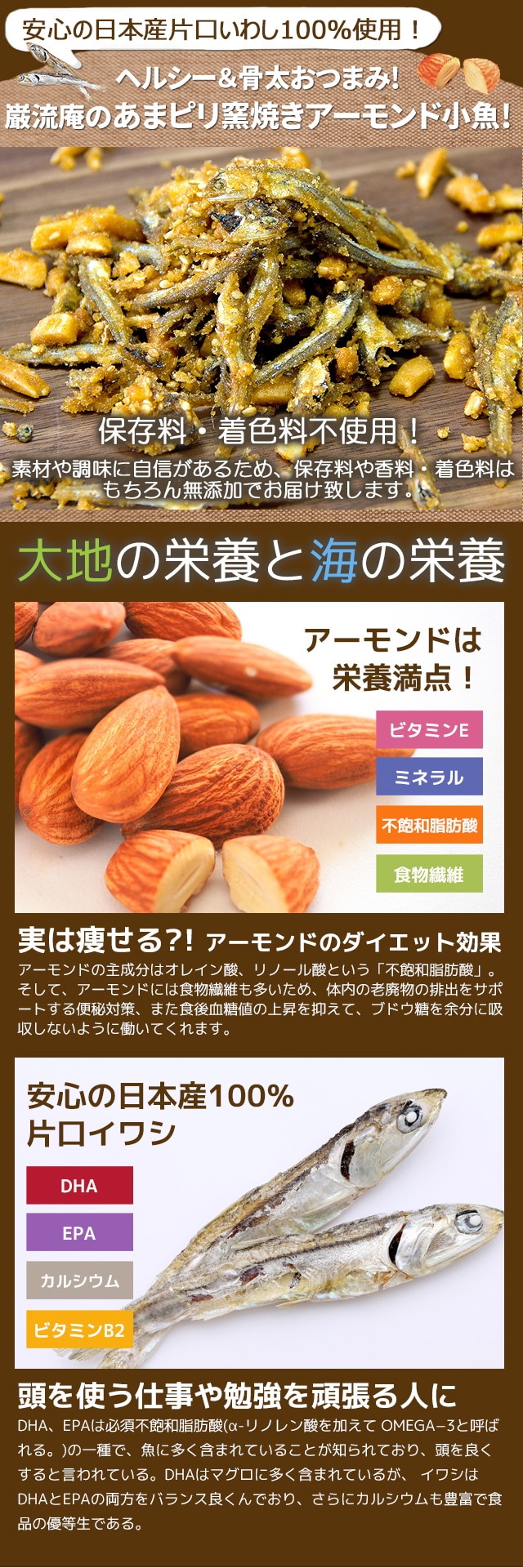 原材料:砂糖、片口いわし、アーモンド、植物油脂、醤油、ごま、唐辛子