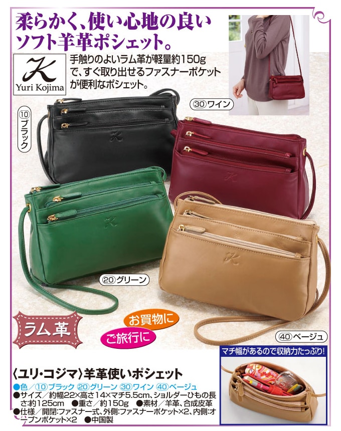 [ベージュ]<ユリ・コジマ>羊革使いポシェット | 柔らかく、使い心地の良いソフト羊革ポシェット。手触りのよいラム革を使用し、すぐ取り出せるファスナーポケットが便利なポシェット。
