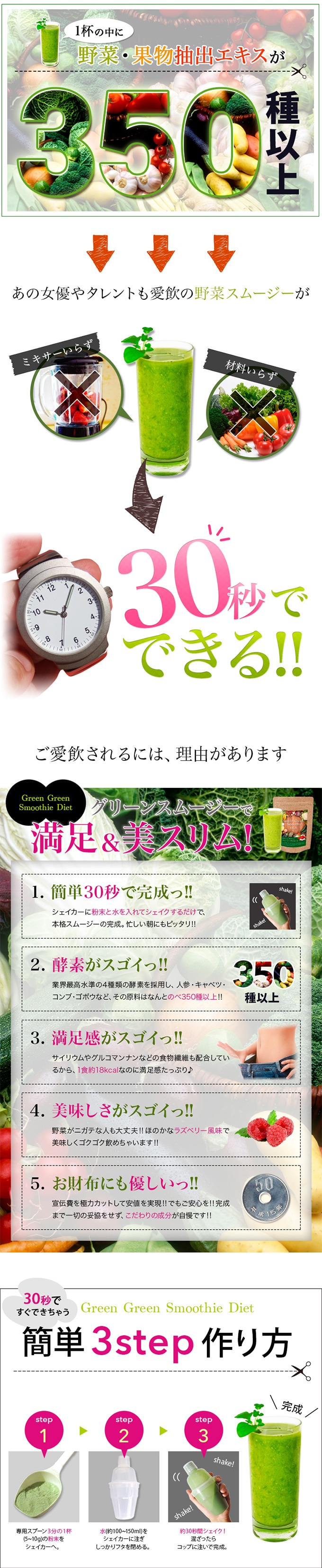 このGreenGreenは、「TVや雑誌等で話題の野菜スムージー」が、「のべ350種類以上の野菜・果物から抽出したエキス」配合で、