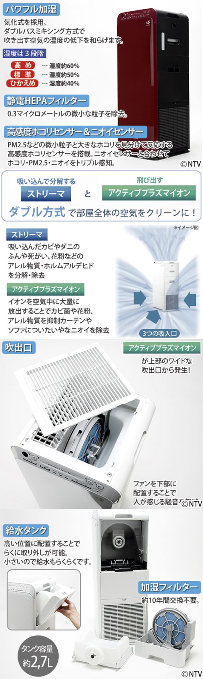 ◆ストリーマ:空気中の汚れを空気清浄機内に吸い込み、中で汚れを分解・除去。花粉の芯まで分解するのはダイキンだけ。集じん・加湿フィルターまで除菌し、加湿する水の細菌まで抑制してくれます。