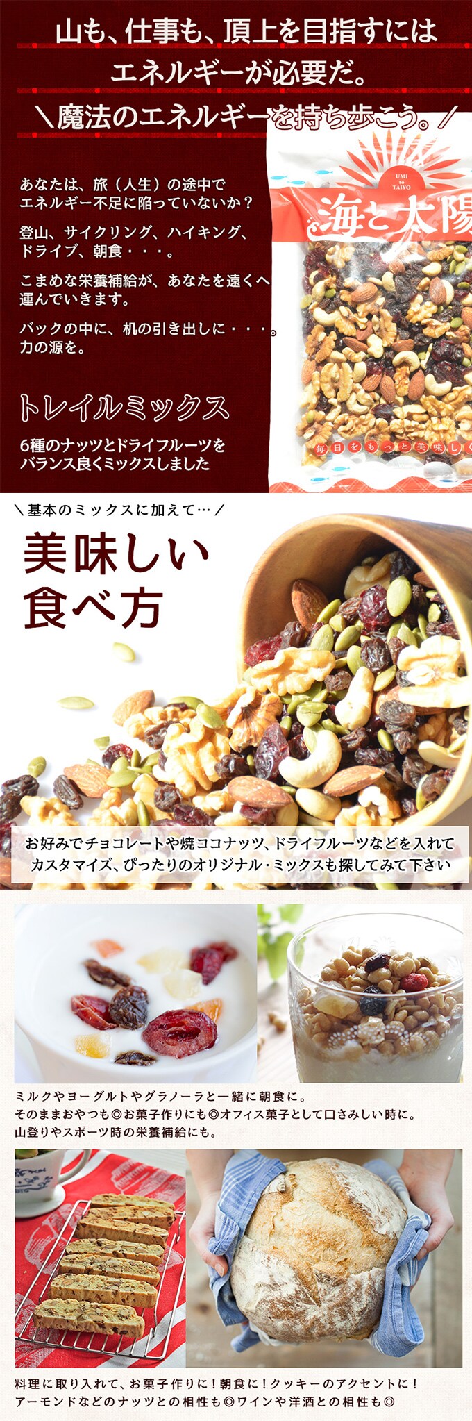 トレイルミックスとは登山やアウトドアなどに持って行くドライフルーツやナッツを混ぜ合わせた行動食のことです。