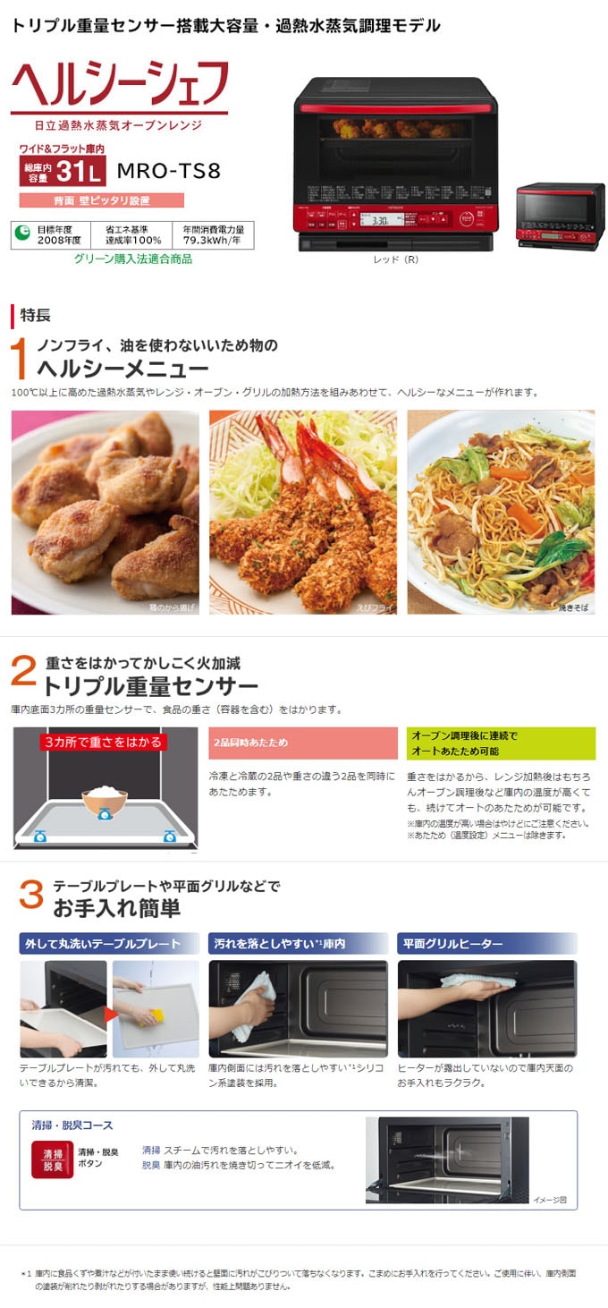 - 日立/過熱水蒸気オーブンレンジ ヘルシーシェフ (レッド/総庫内容量:31L)/MRO-TS8(R)