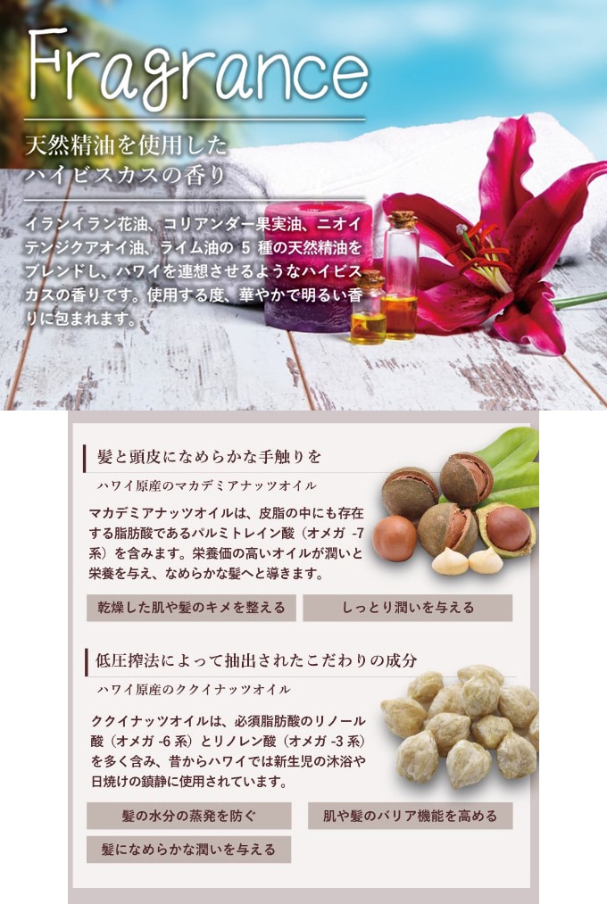 ハワイの日差しと潮風の中でも輝き続ける、ロコ女性たちの美しい髪。その秘密フラガールヘアオイルは、さらっと髪に馴染み、髪に潤い、ツヤとハりを与えます。