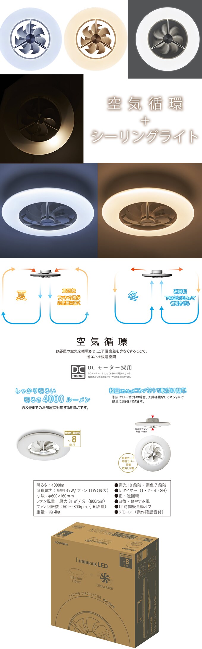 [8畳用]DOSHISHA(ドウシシャ)/シーリングサーキュレーター 正逆回転可能/DCC-08CM | 空気を循環するサーキュレーター付き。夏は涼しい風を、冬は暖かい空気に。