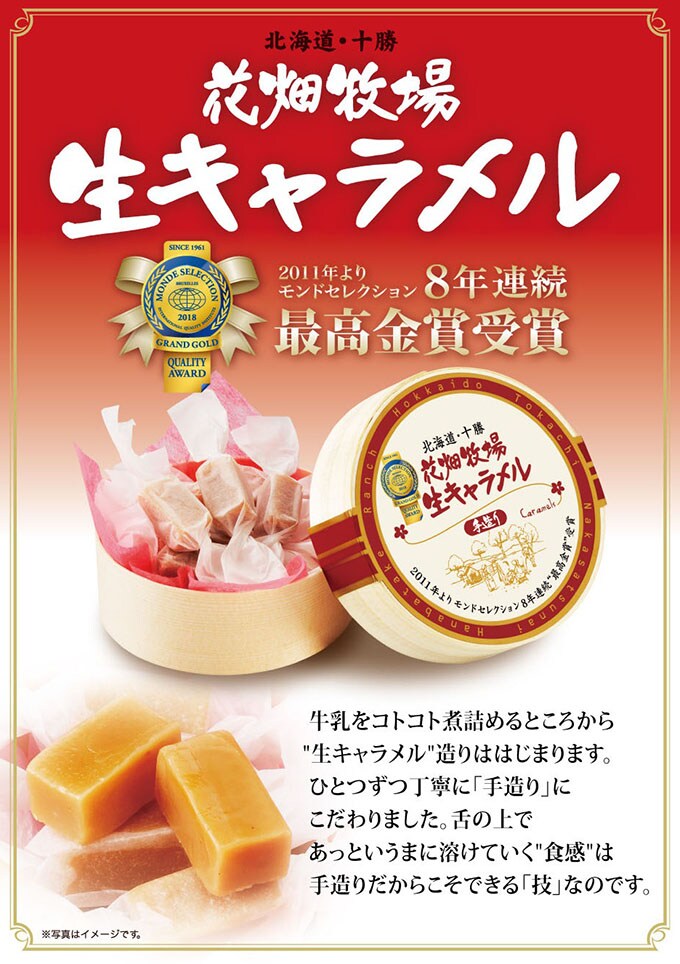 モンド・セレクション最高金賞3年連続受賞記念に作った プレミアムな「生キャラメル」です。 ニュージーランド産のマヌカハチミツを100%使用した、よりまろやかに 高級感あふれる生キャラメルをお楽しみ下さい。 ・