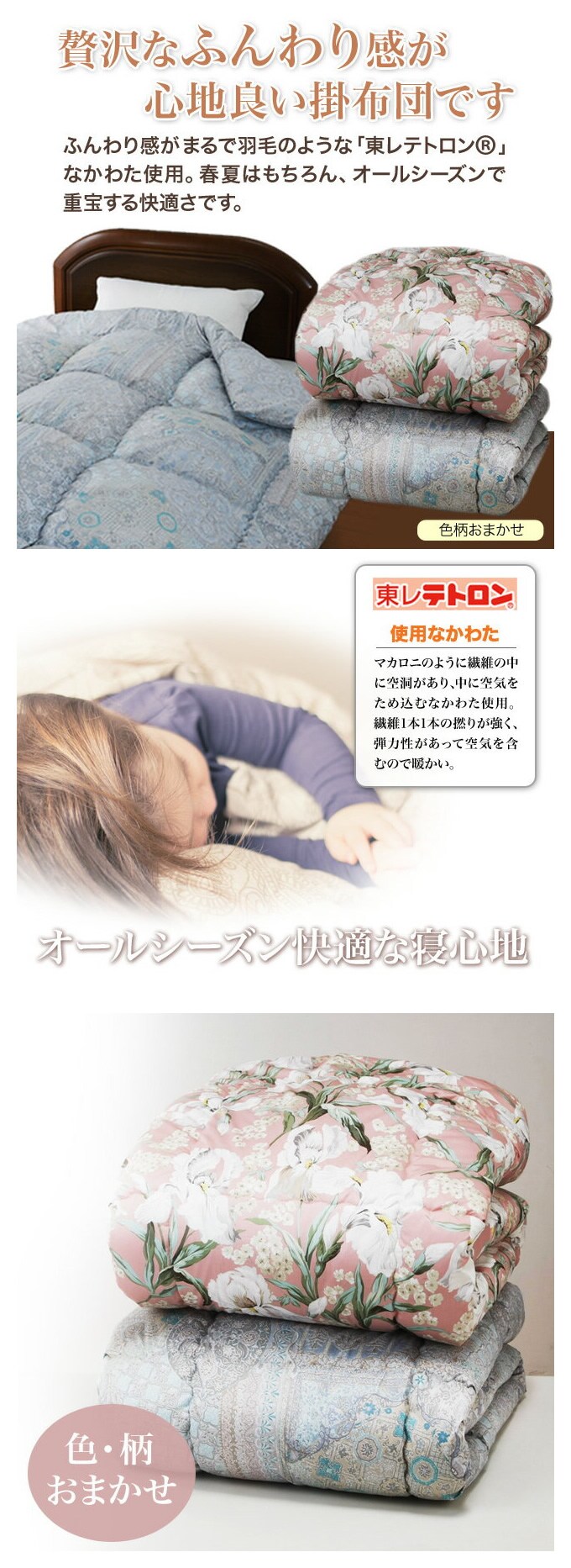 国産色・柄おまかせ東レテトロン綿入り合掛布団 | ふんわり感が贅沢な掛布団。