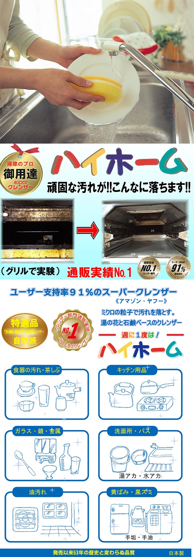 【特長】うれしいほどすっきりクリーン。 手が荒れない。 優れた洗浄力。 環境に優しい。 天然の珪華の華(湯の華)に、ヤシ油使用の高品質石けんを配合した自然派のクレンザー。粒子が細かいのでキズがつきにくく、汚れだけをきれいに取り除きます。