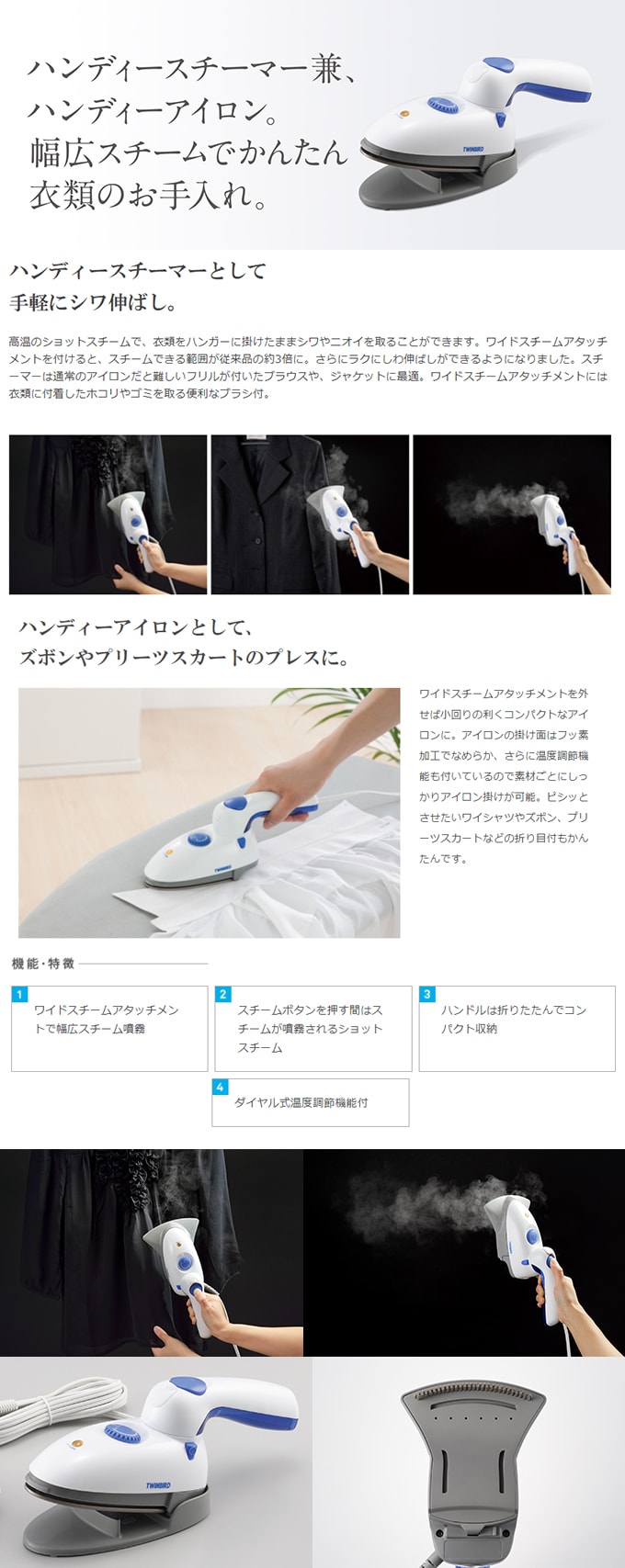 ツインバード(TWINBIRD)/ハンディーアイロン&スチーマー (ブルー)/SA-4093BL|幅広いスチームでかんたん衣類のお手入れ!ワイドスチームアタッチメントで幅広スチーム噴霧!!