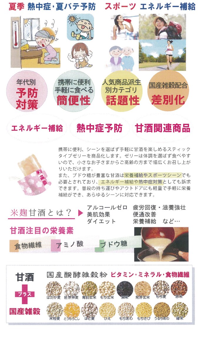 携帯に便利、シーンを選ばず手軽に甘酒を楽しめるスティックタイプゼリーです。 ゼリーは体調を選ばず食べやすいので、小さなお子さまからご高齢の方まで幅広く お召し上がりいただけます。