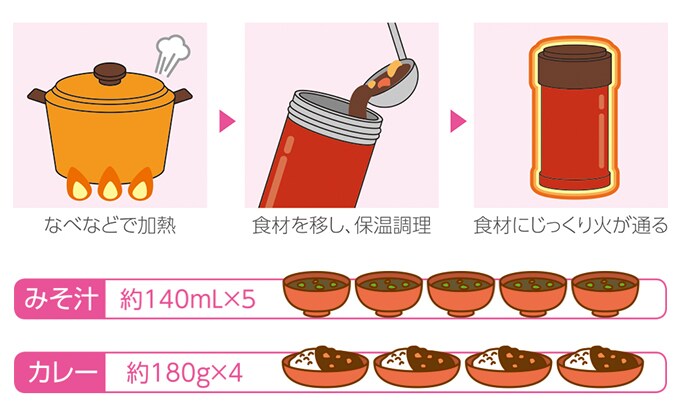 なべや電子レンジで加熱した食材を「クック&フードジャー」に入れ、置いておくだけ。「まほうびん保温」で、じっくり調理します。