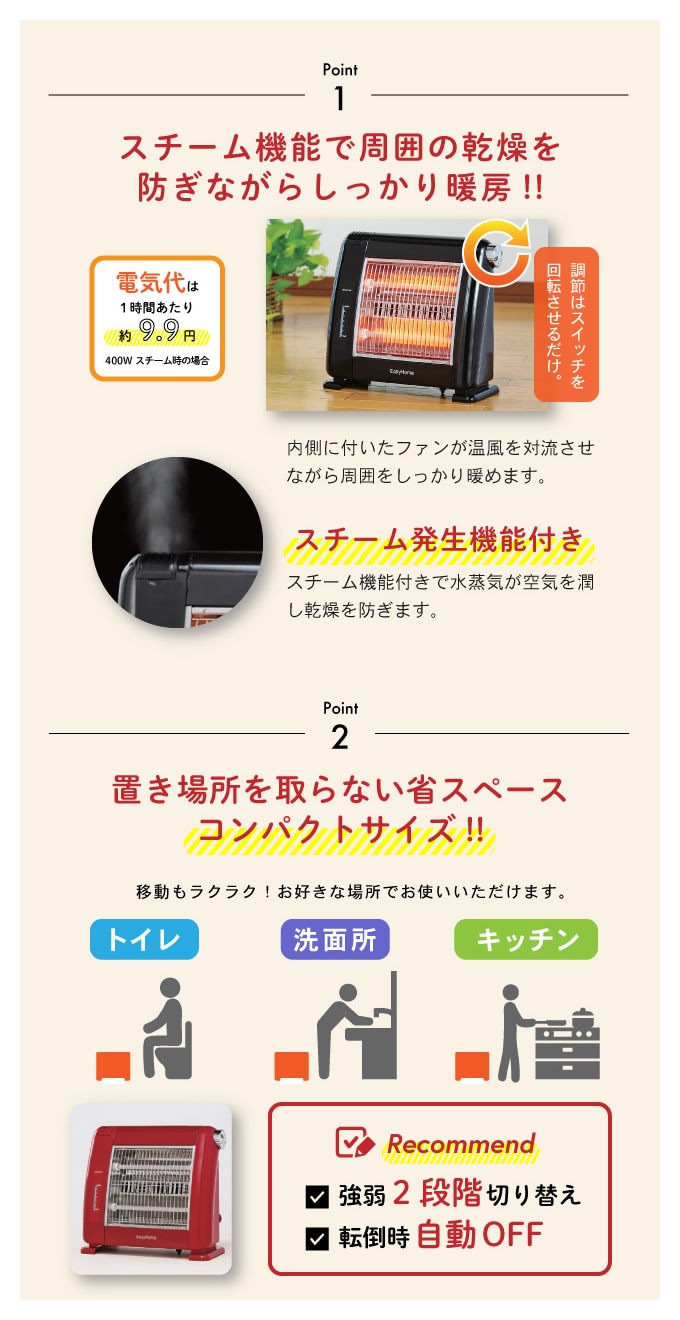 仕様/電源:AC100V(50/60Hz)、消費電力:400W・800W(2段階切り替え)、ロータリースイッチ式:切・強(800W)・弱(400W)・切・弱(400W/スチーム)・強(800W/スチーム)、連続使用時間:約7時間、石英管ヒーター400W×2本、スチーム発生装置付き(満水約220ml)、コードの長さ:約1.6m