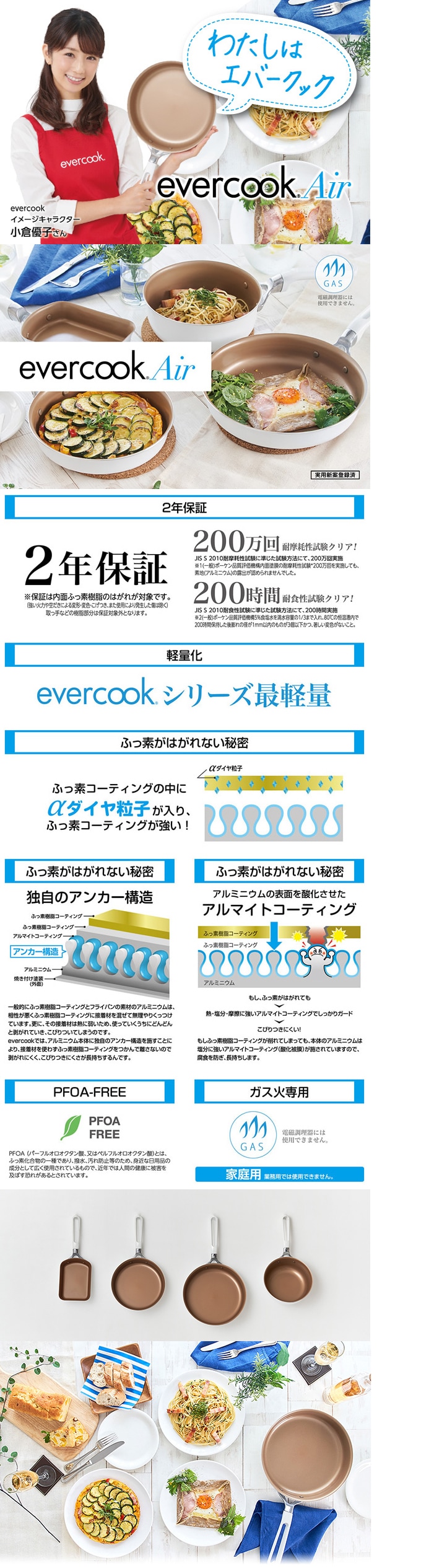 evercook Airevercook Air軽さと美しさをまとった、新しいフライパン2年保証200万回 耐摩耗性試験クリア200時間 耐食性試験クリアPFOA FREE