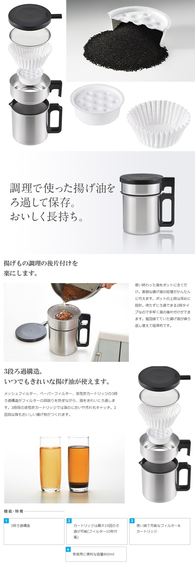 使い終わった油をポットに注ぐだけ。面倒な揚げ油の処理がかんたんに行えます。ポットの上段は深めに設計。