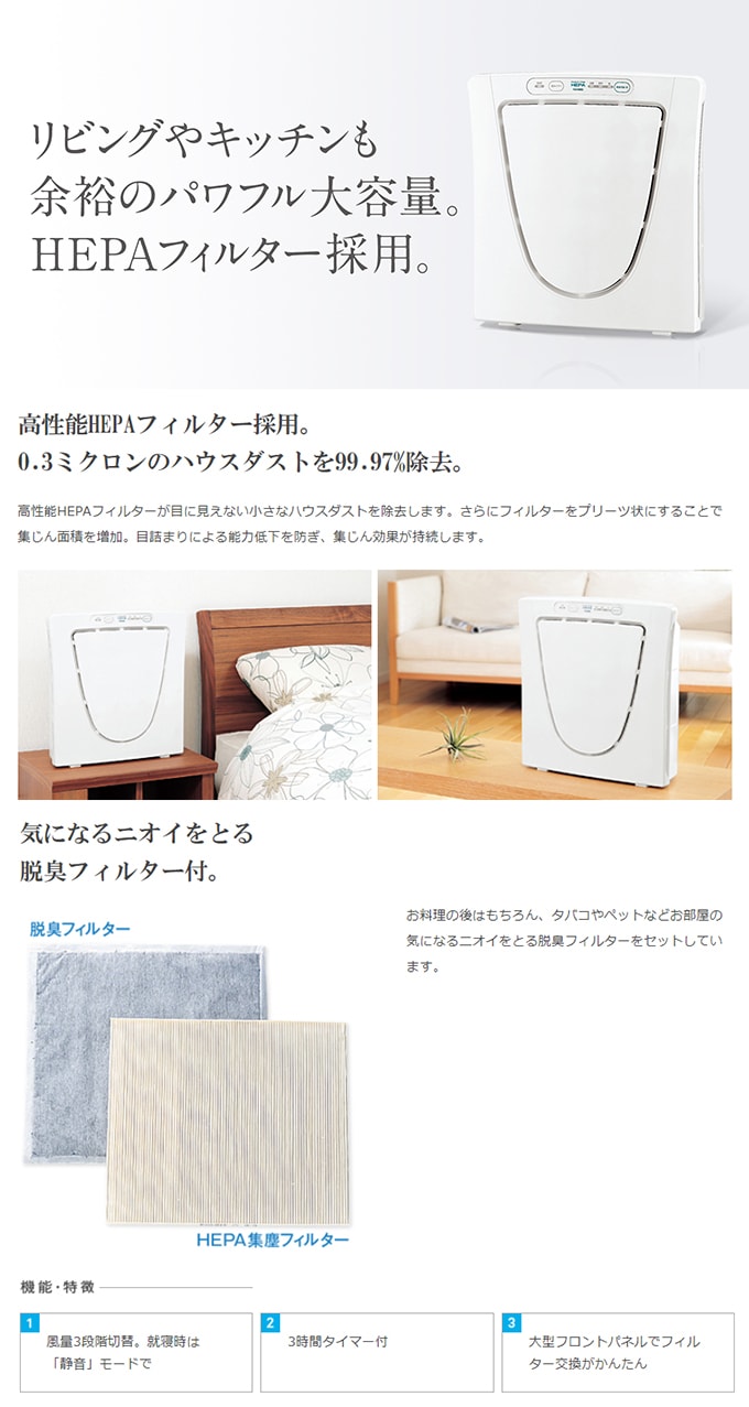 高性能HEPAフィルターが目に見えない小さなハウスダストを除去します。さらにフィルターをプリーツ状にすることで集じん面積を増加。目詰まりによる能力低下を防ぎ、集じん効果が持続します。