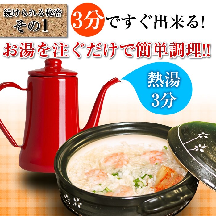 大きめの入れ物に雑炊の素を入れ、200~250ccのお湯を入れ良くかき混ぜてから、3分後にお召し上がりください