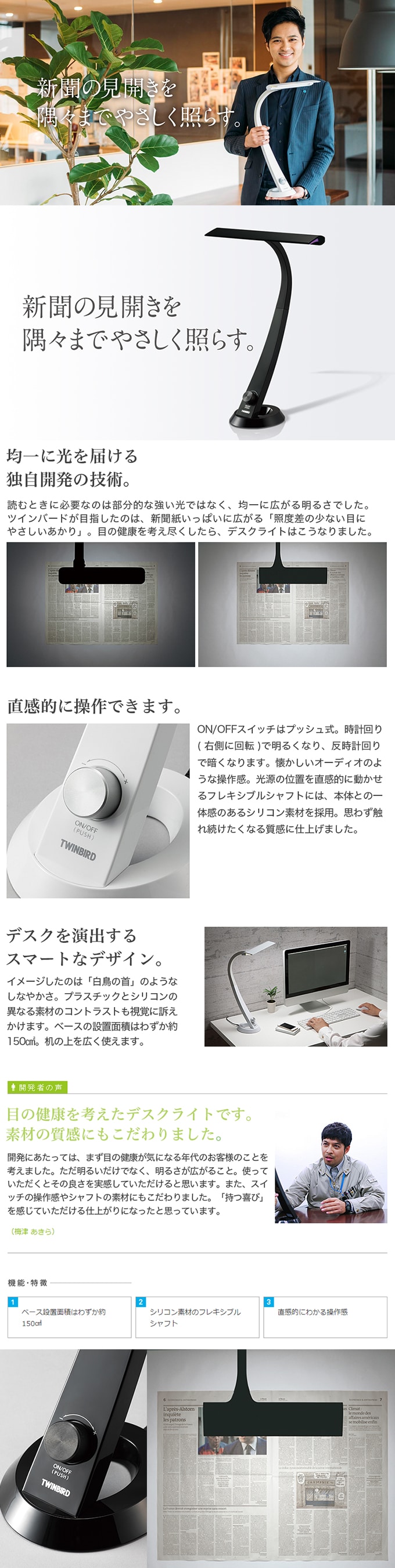 ツインバード(TWINBIRD)/LEDデスクライト Airled (ブラック)/LE-H841B|新聞見開きを隅々までやさしく照らす!光源の位置を直感的に動かせるフレキシブルシャフト!