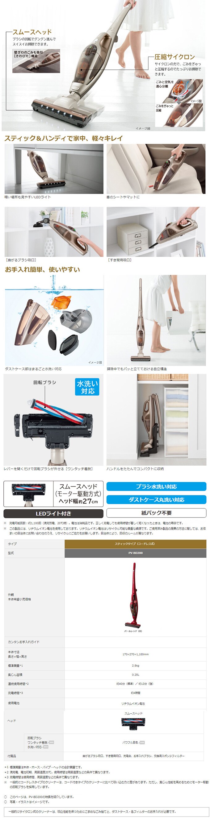 日立/スティッククリーナー(コードレス式)パールレッド/PV-BD200(R) | ハンドルをたたんでコンパクトに収納。ブラシ水洗い対応!女性の方にもおススメな自走式スムースヘッドで軽々キレイに!