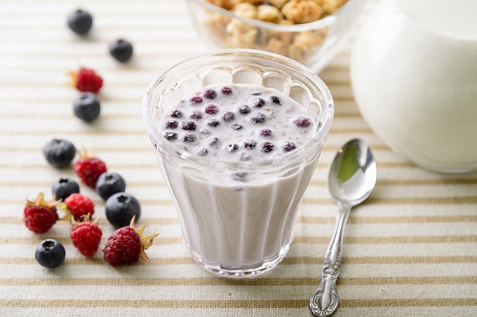 固まるタイプではなく、さらっとした牛乳の中にベリーの果肉が浮かぶドリンクタイプです。