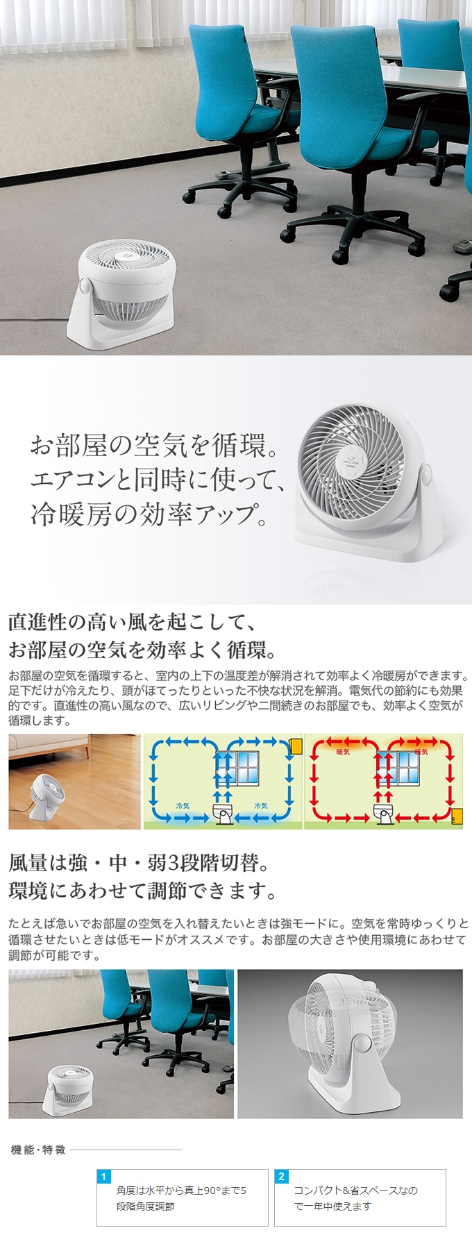 お部屋の空気を循環すると、室内の上下の温度差が解消されて効率よく冷暖房ができます。足下だけが冷えたり、頭がほてったりといった不快な状況を解消。