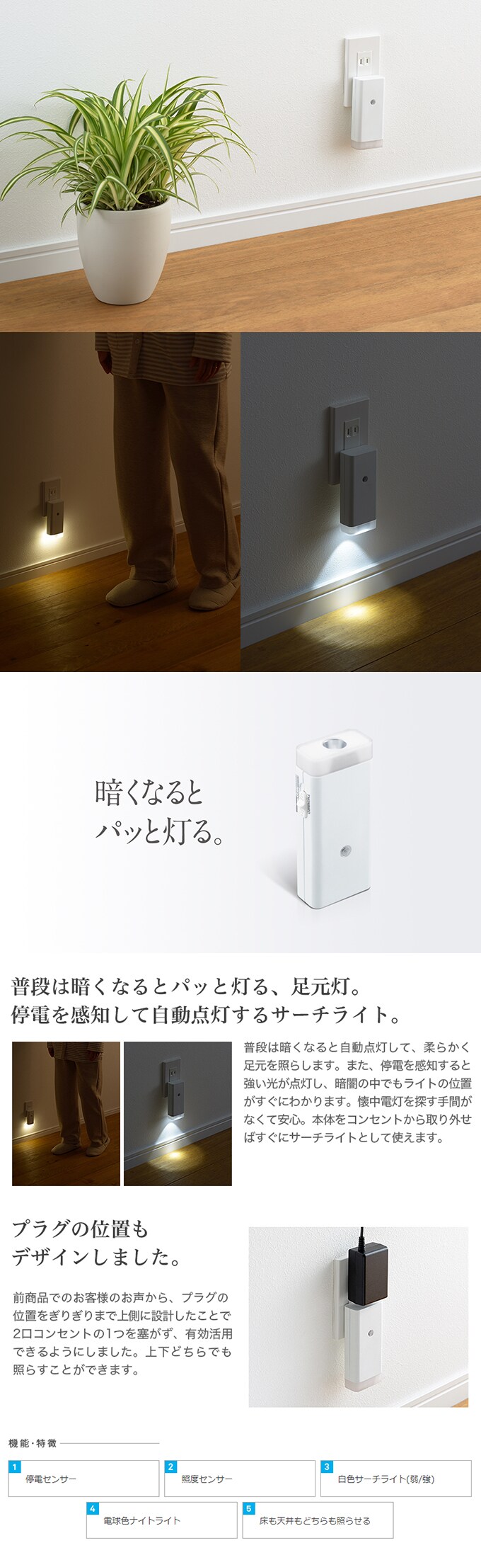 懐中電灯を探す手間がなくて安心。本体をコンセントから取り外せばすぐにサーチライトとして使えます。
