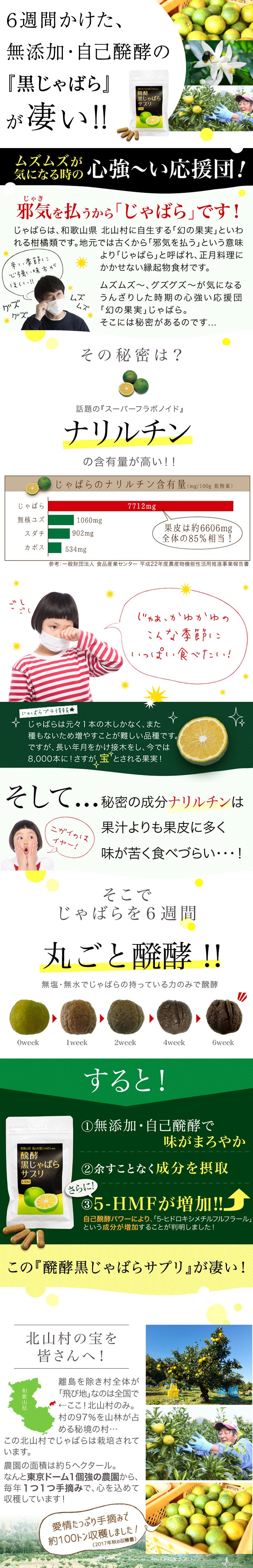 ムズムズが気になるシーズンに注目の成分ナリルチンを多く含有している「幻の果実」じゃばらを約6週間醗酵させたものをサプリにしたのがこの「醗酵黒じゃばらサプリ」です。