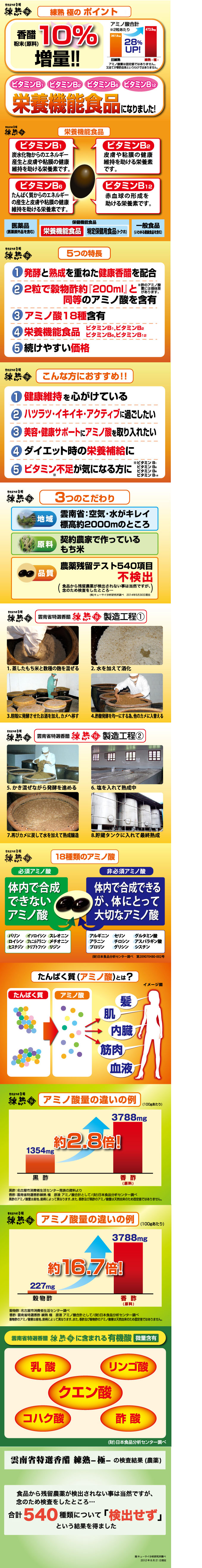こだわりの雲南省香酢を使用。さらに梅肉エキス、18種のアミノ酸、5種類の有機酸を含有した「練熟」 極。使われている香酢は、長い時間(約半年間)手間暇かけられ作られます。