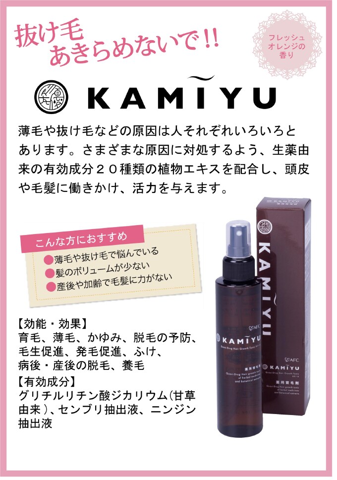 カミーユ薬用育毛剤 | 男女兼用の薬用育毛剤。(育毛、薄毛、かゆみ、脱毛の予防、毛生促進、発毛促進、ふけ、病後・産後の脱毛、養毛)。生薬由来の有効成分と20種類の植物エキスが頭皮と髪に働きかけます。