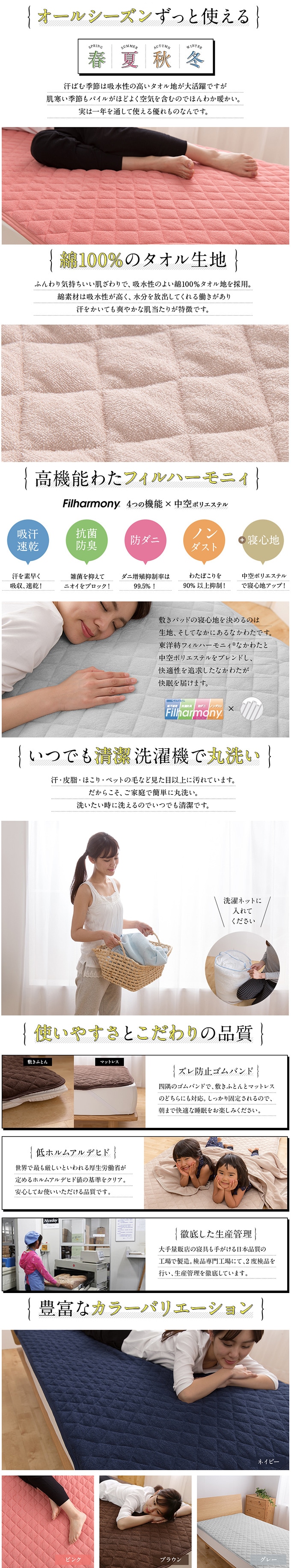 [ミント/シングル/敷きパッド]mofua ふんわりタオル地 綿100% (防ダニ・ 抗菌防臭 東洋紡フィルハーモニィ(R)わた使用) | 汗をかいても爽やかな肌当たり。洗濯機で丸洗いOK!