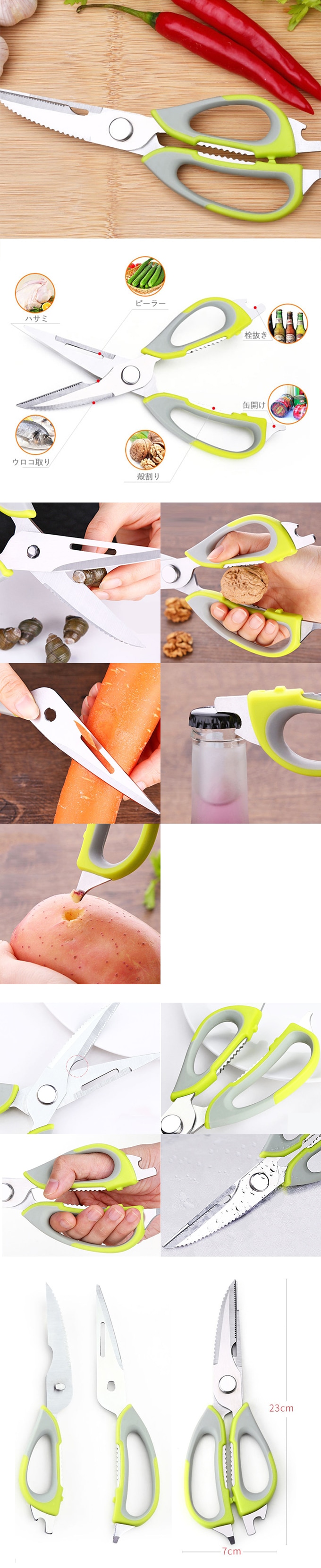 ハサミ、ピーラー、栓抜き、缶開け、殻割り、鱗取りの8種の機能が付いた多機能キッチンバサミです★