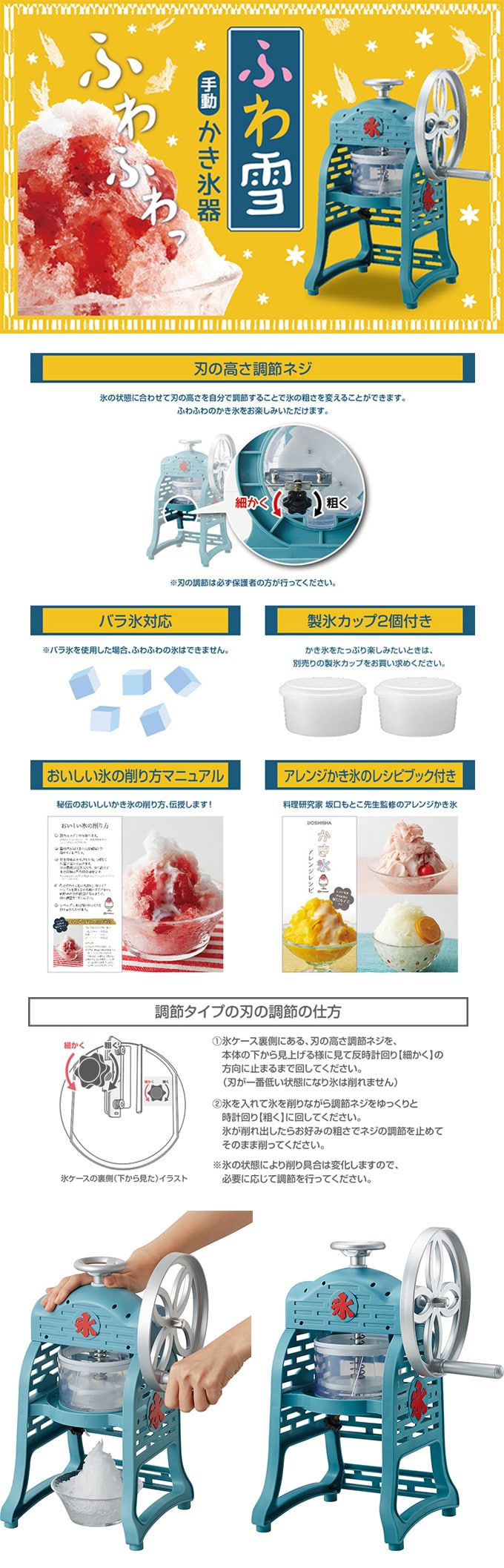 [手動式]ドウシシャ/手動ふわ雪かき氷器/IS-FY-19 | 氷の粗さを無段階ネジ式で調整できるのでどんな質の氷もお好みのさらさらふわふわ感に!ご家庭でかんたん!まわすだけ♪レシピブック付き。