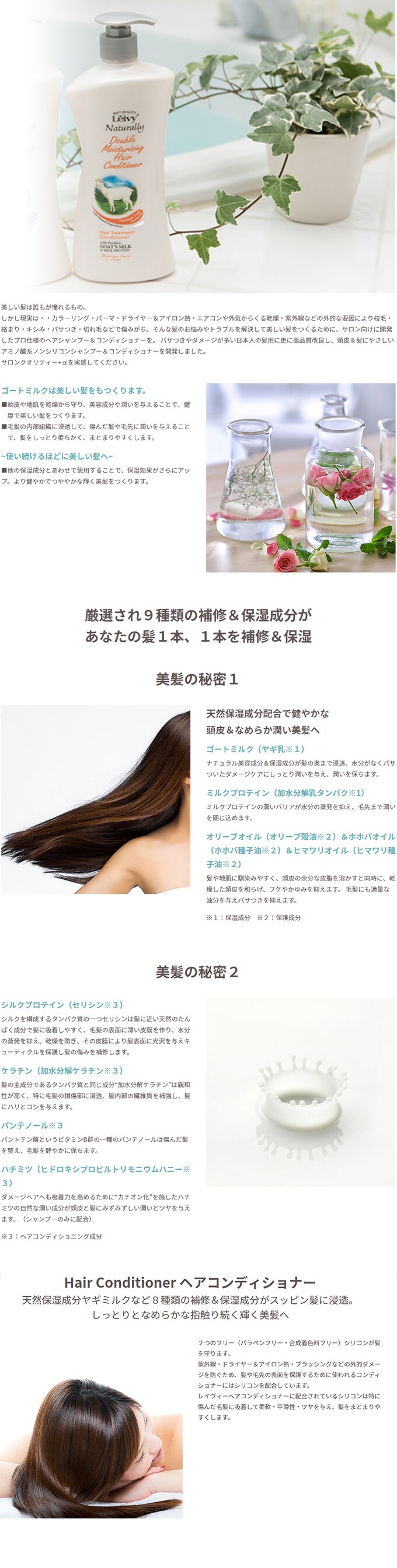 ゴートミルク・ミルクプロテイン・オリーブオイル・ホホバオイル・ヒマワリオイル・シルクプロテイン・ケラチン・パンテノールなど8種類の厳選成分を配合。髪1本、1本を補修&保湿、しっとりなめらかな指触り続く輝く美髪へ導きます。(パラベンフリー・合成着色料フリー)