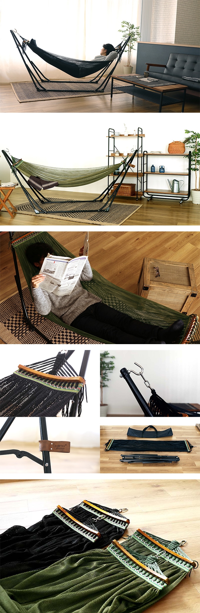 やわらかなメッシュ生地に包まれてゆったり過ごす休日。そんな、ハンモックのある憧れの生活を気軽に楽しんでいただける一台です。
