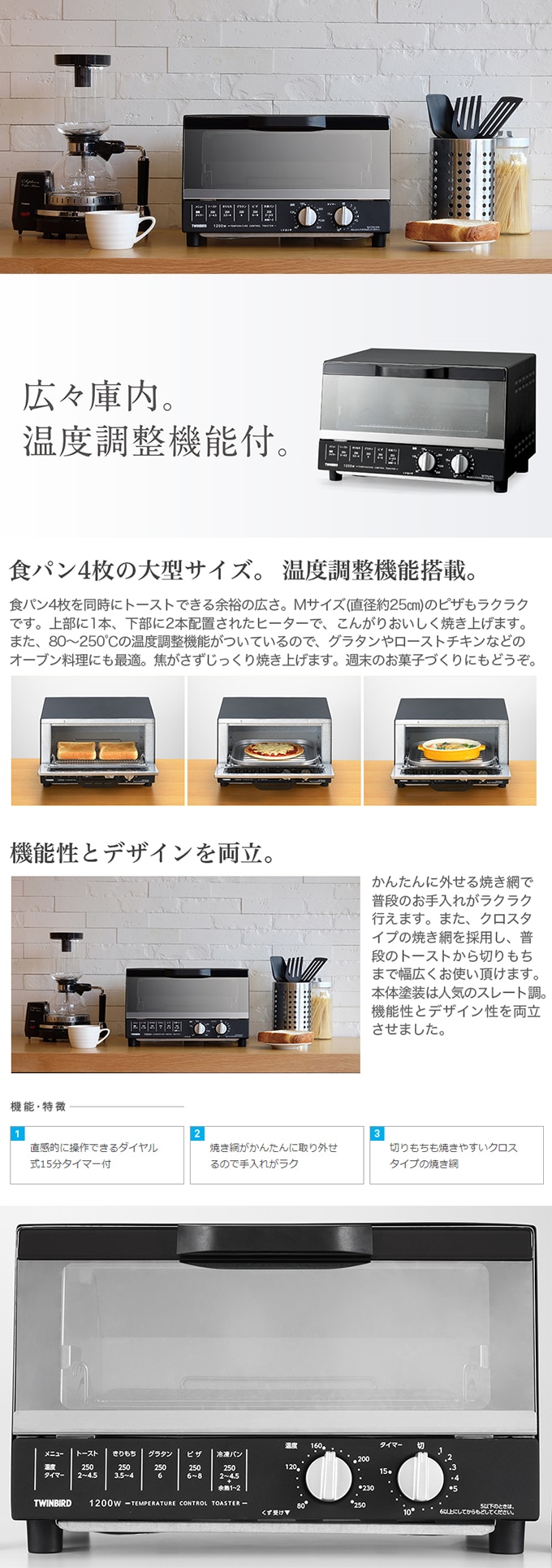 ツインバード(TWINBIRD)/オーブントースター (ブラック)/TS-4185B|広々庫内!食パン4枚の大型サイズ。 温度調整機能搭載!