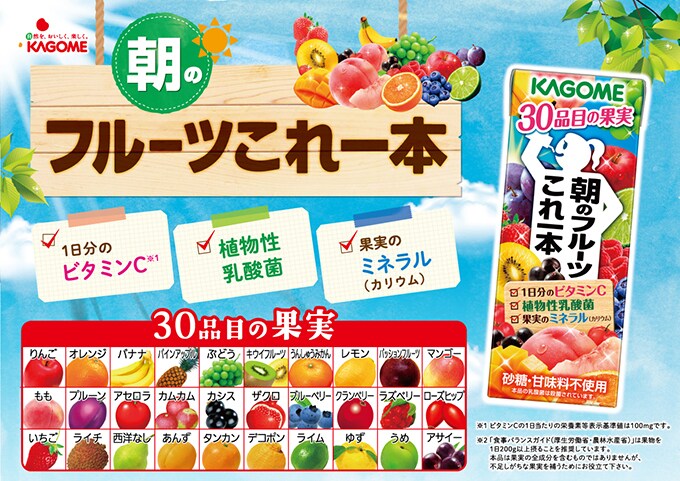 「朝のフルーツこれ一本」は、アサイーやゴールドキウイ等の30品目の果実と植物性の乳酸菌を使用し、朝に最適なすっきりとしたおいしさで、1日分のビタミンCと果実由来のミネラル(カリウム)が摂れる果実ミックス飲料です。