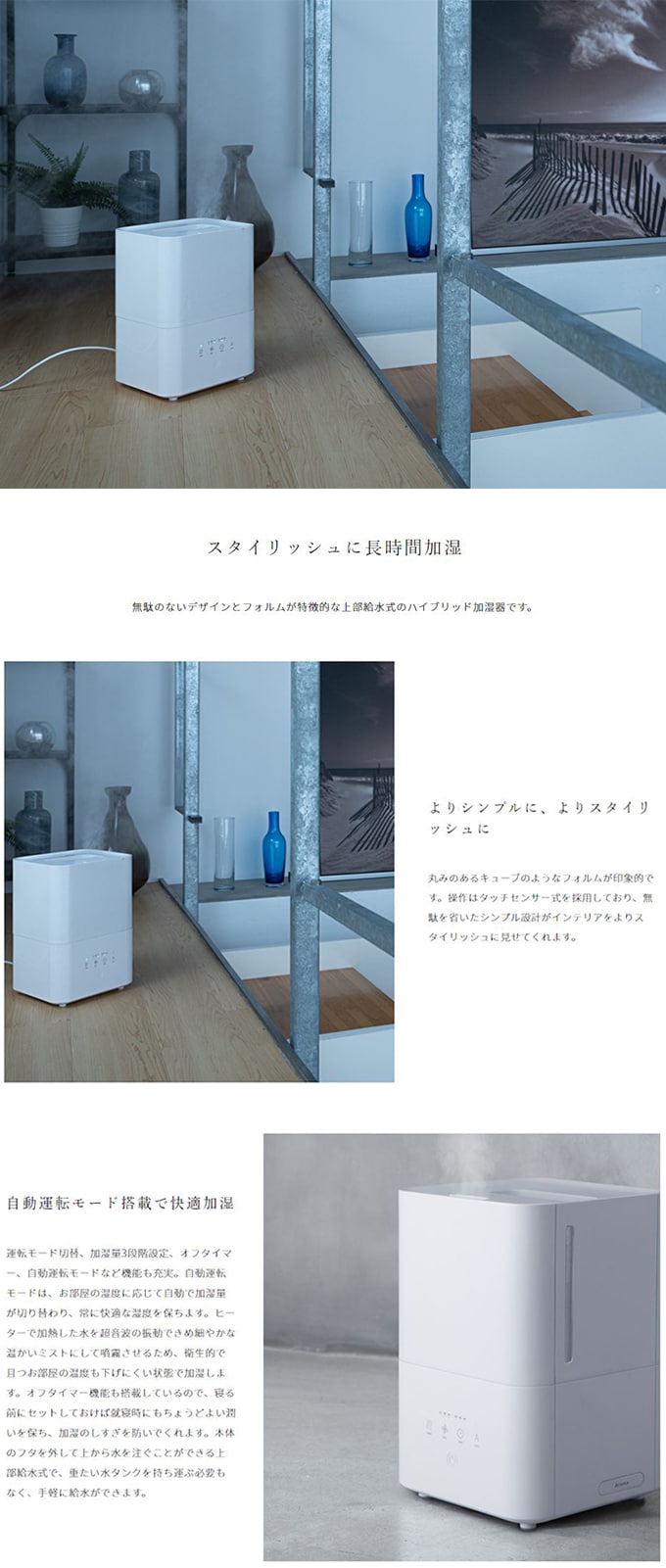 スリーアップ/ハイブリッド加湿器 「ボクシー」 ホワイト | ヒーターで加熱した水を超音波の振動できめ細やかな温かいミストにして噴霧!上部給水式で手軽に給水!自動運転モード搭載で快適加湿を。