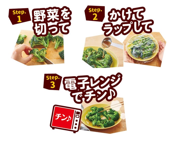 切った野菜に、かけてチンするだけで温かい野菜のおかずをつくることができる電子レンジ専用調味料です。簡単・手軽につくれるため、忙しい平日の夕食に最適です。どんな野菜も短時間でおいしいおかずになります。