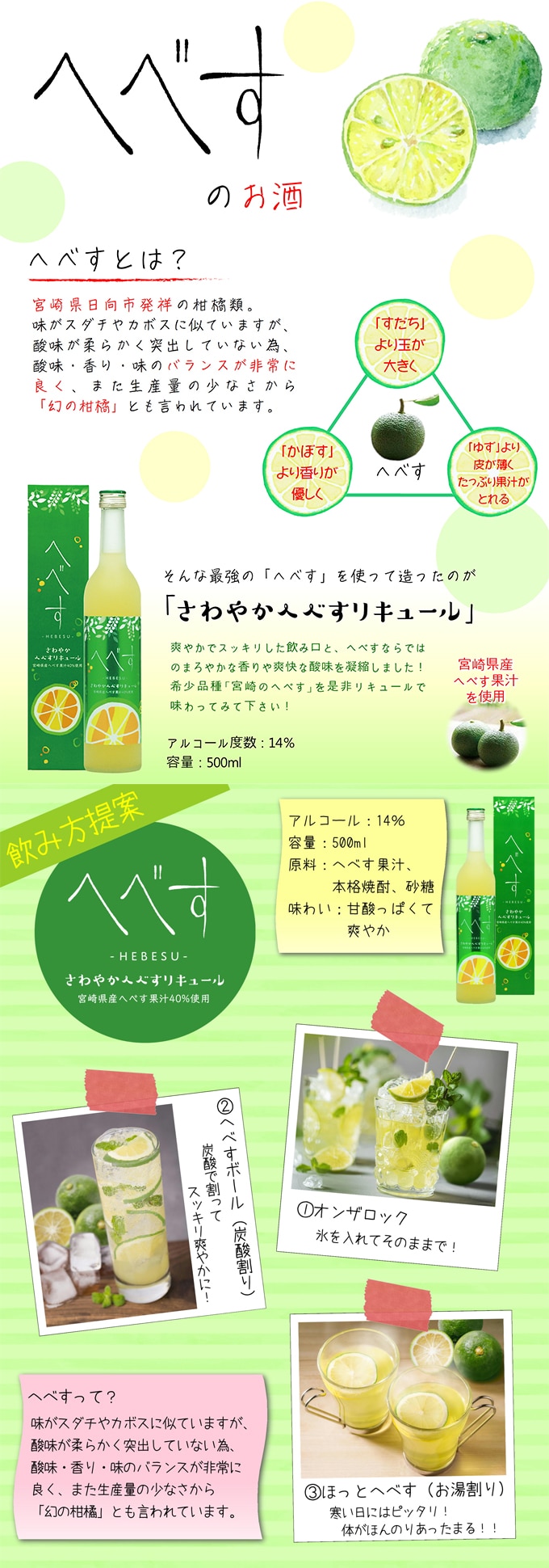 そんな希少な「へべす」を贅沢に使い、宮崎の名水21選に選ばれた「榎原湧水」を仕込水、割り水に使用した宮崎県日南特産の芋焼酎「爽 飫肥杉」をベースに仕込みました。昔から地元ではへべす割りで親しまれている「爽 飫肥杉」とへべすの相性は抜群で、爽やかでスッキリとした飲み口と、へべすならではのまろやかな香りや爽快な酸味を凝縮した新感覚リキュールです。
