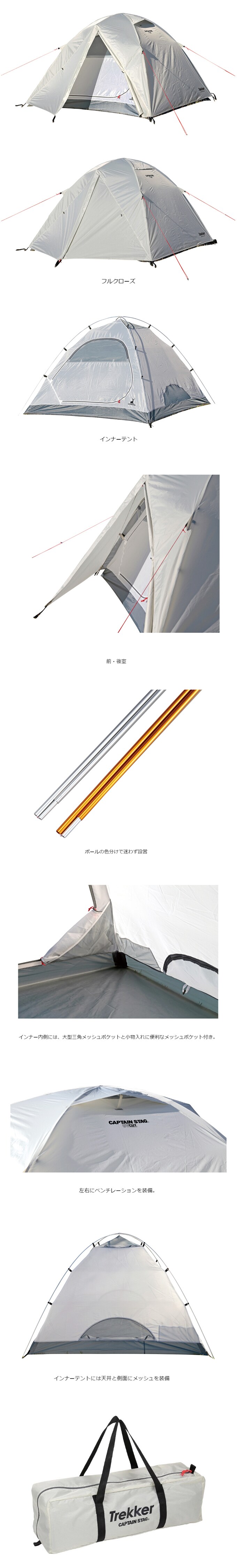 キャプテンスタッグ/トレッカー アルミドームテント3UV|快適装備をプラスした本格的なドームテント!クロスフレームに吊り下げ式インナーテントの採用で設営と撤収が簡単スピーディー!収納バッグ付
