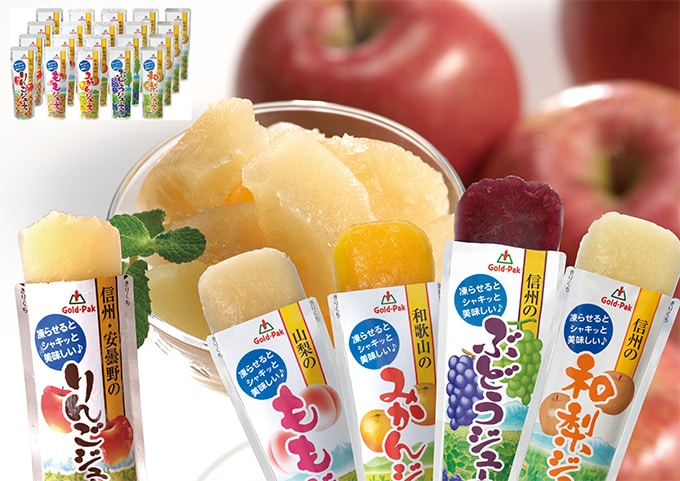 国産、産地限定にこだわった、果汁100%の凍らせて食べられるシャーベットです。信州・安曇野産りんご、山梨県産もも、和歌山県産みかん、長野県産ぶどう、長野県産和梨の5種類のアソートセットです。シャーベット状になるので、シャキシャキの食感をお楽しみ頂けます。