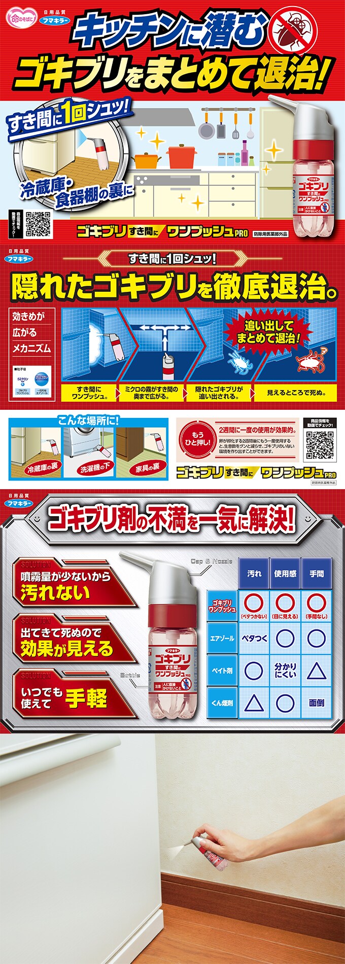 ゴキブリに向けて噴霧を続ける従来のエアゾール製品と異なり、ワンプッシュで効果が出るので、噴霧量が少なくて済み、1回の噴射に含まれる油量も少ないため、床や壁が汚れません。